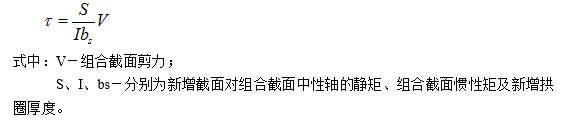 新、老截面間的有效粘結(jié),是保證新澆注混凝土層與原拱圈截面共同受力的保證。當不考慮界面相對滑移時,得到剪應力簡化計算公式。