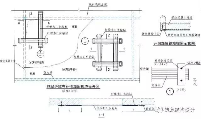 當(dāng)開(kāi)洞大小小于1000mmX1000mm時(shí),切斷鋼筋數(shù)量≤20%時(shí),當(dāng)板受影響小,可按照構(gòu)造進(jìn)行加固,采用粘鋼和粘接碳布方式來(lái)進(jìn)行加固處理;