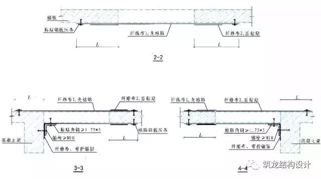 無(wú)論是承擔(dān)負(fù)彎矩的板面鋼板還是碳布,都會(huì)因墻體阻擋,無(wú)法貫通,此時(shí)可采用螺桿及短角鋼穿墻拉結(jié)錨固傳遞拉力。對(duì)于框架結(jié)構(gòu)現(xiàn)澆樓板角區(qū)開(kāi)洞,承擔(dān)負(fù)彎矩的板面鋼板或碳布,都應(yīng)彎折錨固與邊梁外側(cè),并滿足錨固長(zhǎng)度要求。