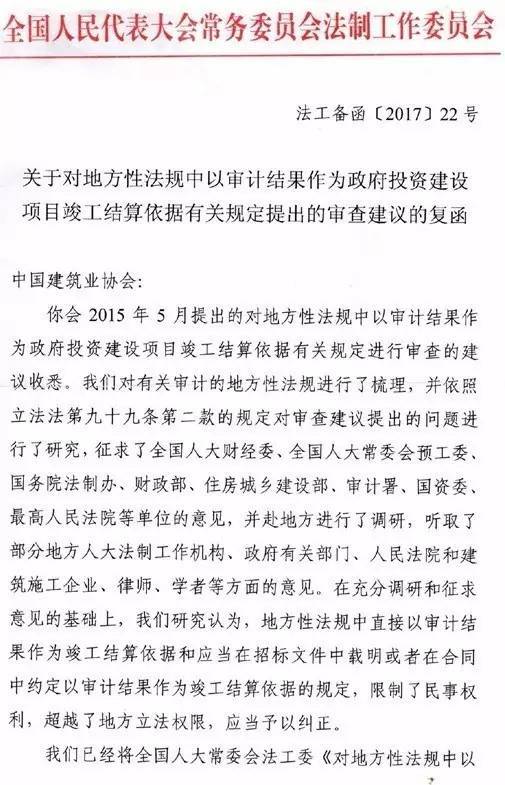 法工委復函《關于對地方性法規(guī)中以審計結果作為政府投資建設項目竣工結算依據(jù)有關規(guī)定提出的審查建議的復函》。該復函提出,經過充分調研和征求意見,認為地方性法規(guī)中直接以審計結果作為竣工結算依據(jù)和應當在招標文件中載明或者在合同中約定以審計結果作為竣工結算依據(jù)的規(guī)定,限制了民事權利,超越了地方立法權限,應當予以糾正。