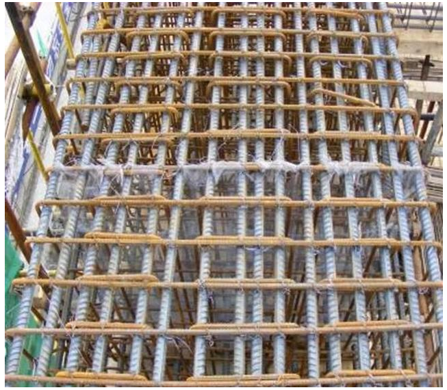 在地下室頂板結(jié)構(gòu)層梁、板底模支好,梁板鋼筋綁扎好后,進(jìn)行技術(shù)交底后實(shí)施,在離柱墻邊500mm處欄設(shè)網(wǎng)孔為5- -8mm的鋼絲網(wǎng),鋼絲直徑0.5-0.9mm (簡(jiǎn)易收口網(wǎng)),用22號(hào)鐵絲綁扎牢固。在梁部位直接綁扎在梁箍筋上,箍筋鋼度不夠的用雙箍筋或用圓1 2鋼筋加強(qiáng);在板部位鋼絲網(wǎng)直接綁在板上下層筋上、板較厚的根據(jù)板厚及上下層筋直徑、.上下保護(hù)層厚 度用園12鋼筋焊成框,中間間隔200焊一根橫擋, 然后將鋼絲網(wǎng)綁扎在鋼筋框上欄設(shè)在板..