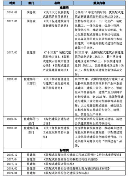 2016年是裝配式建筑的政策元年,《關(guān)于大力發(fā)展裝配式建筑的指導(dǎo)意見》正式發(fā)布,明確提出“力爭用10年左右的時間,使裝配式建筑占新建建筑面積的比例達到30%”這一具體目標(biāo),之后,相關(guān)部門陸續(xù)出臺了一系列政策和標(biāo)準(zhǔn)類文件。
