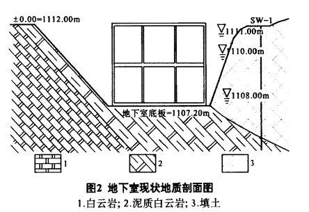 貴州巖溶地區(qū)某建筑物位于斜坡地帶,建筑物長(zhǎng)93m,寬36m,地上3層,地下l層(-4.8m架空停車場(chǎng)),局部地下室,地下室長(zhǎng)38.8m,寬36m,獨(dú)立柱基礎(chǔ),單柱最大荷重3800kN,地基持力層為中風(fēng)化泥質(zhì)白云巖,Ⅱ類建筑場(chǎng)地。后設(shè)計(jì)改地下室為地下設(shè)備試驗(yàn)室,設(shè)計(jì)地坪標(biāo)高1112.000m,地下室底板標(biāo)高為1107.200m,框架結(jié)構(gòu)。該工程于2009年12月完成巖土工程勘察,2011年3月開(kāi)始基礎(chǔ)施工和基坑開(kāi)挖,在2011年6月4~8連續(xù)強(qiáng)降雨,大量的地表水漫流灌入地下室場(chǎng)地內(nèi),基坑大量積水,造成地下室底板上浮,導(dǎo)致局部結(jié)構(gòu)梁拉裂,11軸交G軸上浮高達(dá)68mm,16~17軸交G軸上浮高達(dá)48mm,15~16交B~C軸因?yàn)殡娞菥瓷细?見(jiàn)圖1)。此時(shí)該工程才完成地基基礎(chǔ)施工和地下室頂板(1層樓面)施工,基坑還未回填。