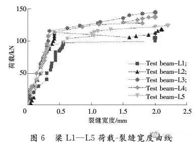 通過試驗(yàn)梁荷載-裂縫寬度曲線,可以看出,未加固梁在混凝土開裂后,曲線斜率變小,裂縫變化較快,平均裂縫間距增大。而加固梁在受拉鋼筋屈服前,裂縫緩慢發(fā)展,直到碳板失效,裂縫才迅速增大。