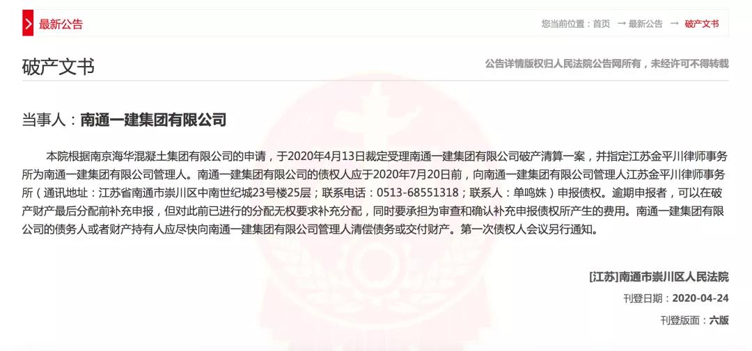 發(fā)布日期:2020-05-08 09:29:49 瀏覽量:877最近,人民法院公告網(wǎng)的一則消息吸引了很多人的注意:南通市崇川區(qū)人民法院于2020年4月13日,裁定受理南通一建集團(tuán)有限公司破產(chǎn)清算一案。