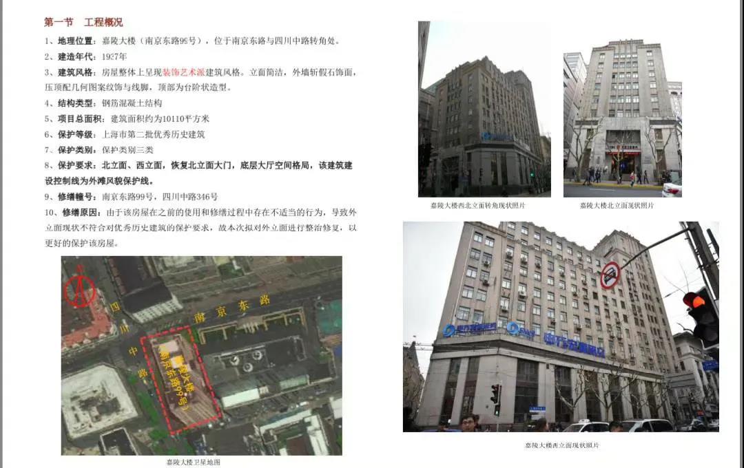 嘉陵大樓由大地產商、猶太人哈同所建,用他妻子中國女子羅迦陵的名字命名(后改為“嘉陵”)。大樓占地1084平方米,由英商德和洋行與世界實業(yè)公司聯(lián)合設計,華商新申營造廠承包打樁工程,陶桂記營造廠承建,建筑面積10110平方米,1937年12月竣工。大樓北低南高,分別為8層、10層和13層,鋼筋混凝土結構。建筑造型與文藝復興風格的建筑大相徑庭,沒有繁復的裝飾和線條,顯示了近代建筑簡潔明朗的風格。建筑立面是水泥鏨假石和鋼窗,底層勒腳采用金山石。內部水暖、消防設施齊全,用桃木做護壁,柳安木做地板。目前,嘉陵大樓位于外灘歷史文化風貌區(qū)內,系第二批市優(yōu)秀歷史建筑,保護類別為三類。