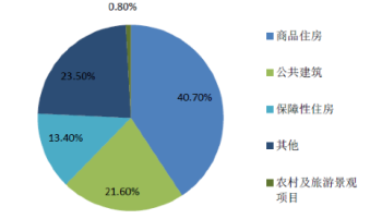 從應(yīng)用領(lǐng)域來看,裝配式主要用于商品住房、公共建筑和保障性住房,占比各為40.7%、21.6%、13.4%。