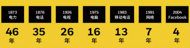 以美國為例,新技術(shù)從誕生到普及率達(dá)到總?cè)丝诘?5%所需時長如下圖所示: